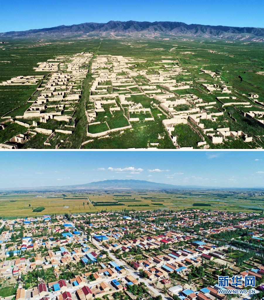 這是一張拼版照片,上圖為:經過多年的生態(tài)修復,寧夏吳忠市紅寺堡區(qū)新莊集鄉(xiāng)的移民舊址已逐漸被綠色覆蓋;下圖為:戈壁荒灘上建起的紅寺堡移民新村(2018年9月8日攝,無人機照片)。新華社記者 王鵬 攝