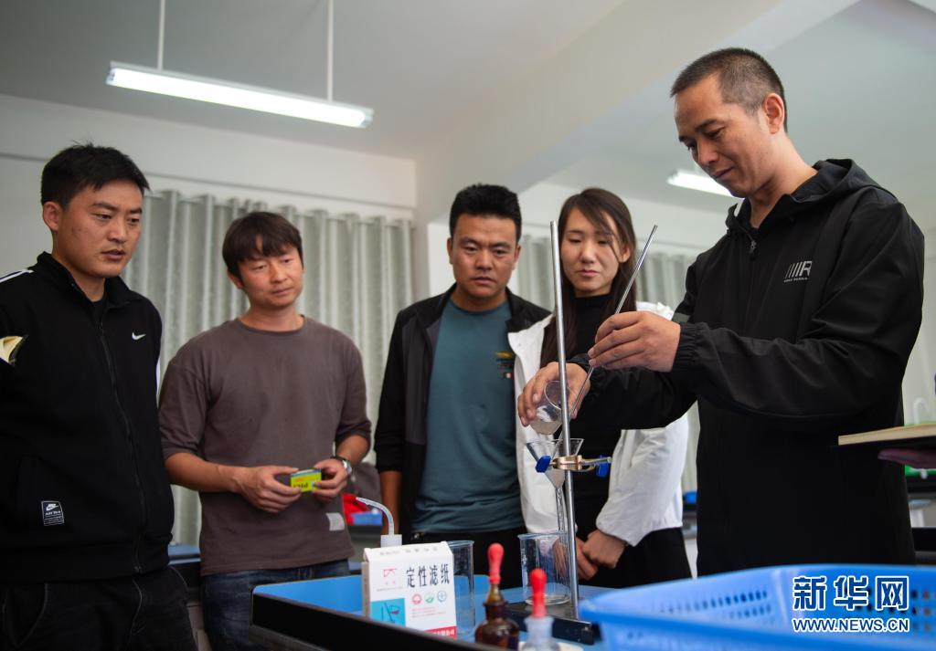 北京市援青支教教師、來自通州區(qū)陸辛莊學校的化學教師祁生貴(右一)在青海省玉樹州第四民族高級中學指導學校教師進行實驗教學(2020年8月12日攝)。新華社記者 陳鐘昊 攝