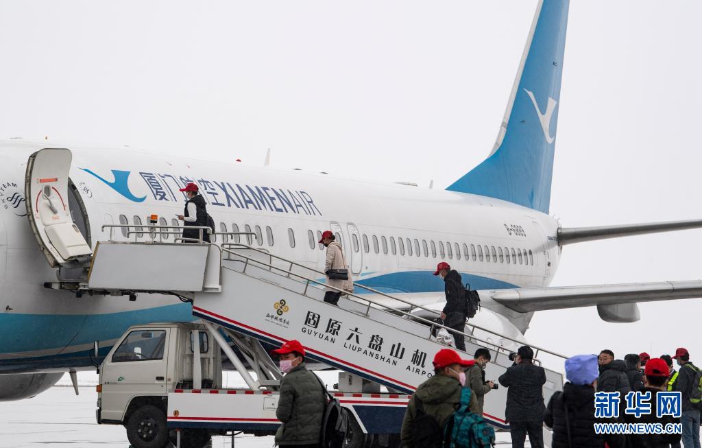 在寧夏固原六盤山機場,固原市原州區(qū)、西吉縣的務工人員乘包機前往福建(2020年2月27日攝)。新華社記者 馮開華 攝