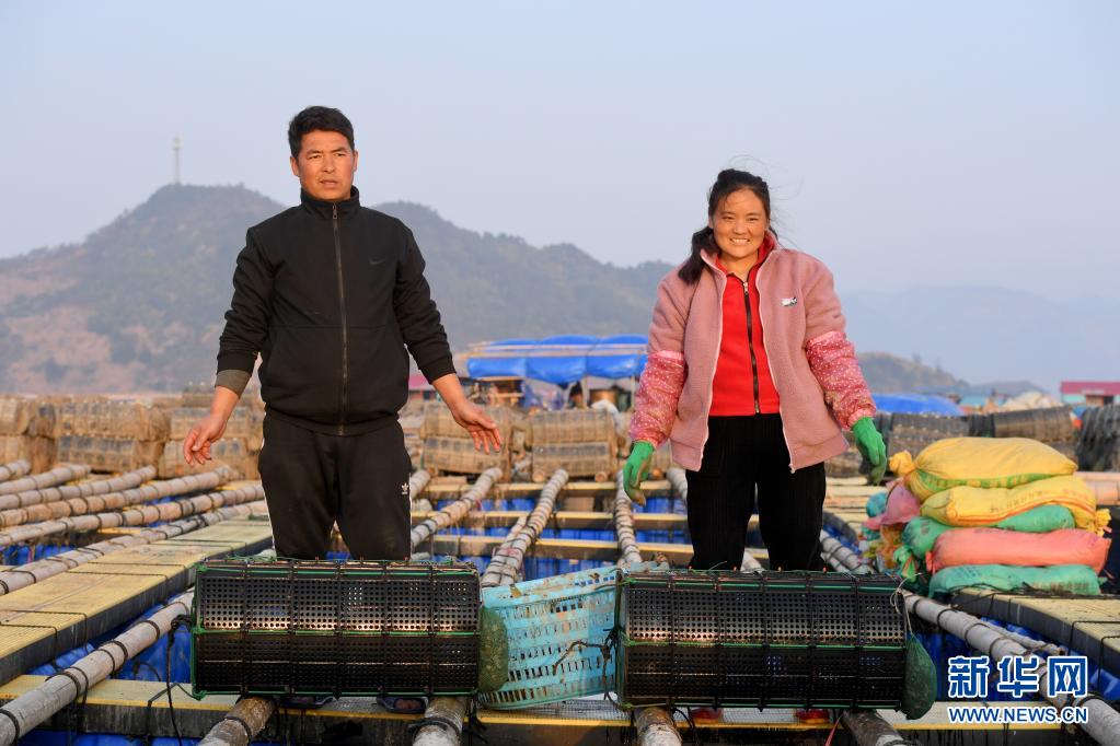 “春運母親”巴木玉布木與丈夫巫其石且從四川涼山彝族自治州老家輾轉來到福建省霞浦縣溪南鎮(zhèn)海域,從事海上漁排海參養(yǎng)殖。這是2月4日在漁排上拍攝的巴木玉布木(右)與丈夫巫其石且。新華社記者 姜克紅 攝