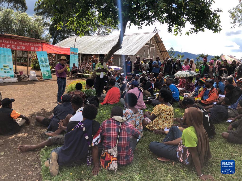 中國援巴布亞新幾內(nèi)亞菌草旱稻項目專家組組長林應(yīng)興(戴草帽者)在巴布亞新幾內(nèi)亞東高地省中國援助巴新菌草和旱稻技術(shù)項目第9期培訓(xùn)班上授課(2020年12月15日攝)。新華社發(fā)