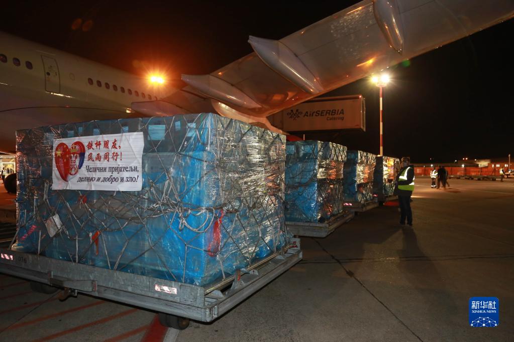 在塞爾維亞首都貝爾格萊德,寫有 “鐵桿朋友,風(fēng)雨同行”字樣的中方捐贈醫(yī)療物資從飛機(jī)上卸下(2020年3月21日攝)。新華社記者 石中玉 攝