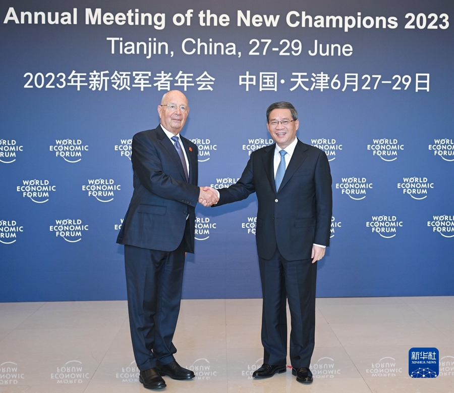 6月26日下午,國務(wù)院總理李強(qiáng)在天津會(huì)見世界經(jīng)濟(jì)論壇主席施瓦布。新華社記者 岳月偉 攝