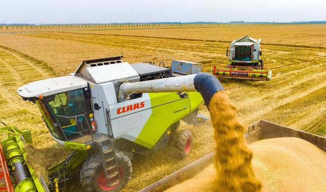 6月7日,在河南省駐馬店市西平縣老王坡高標準農(nóng)田,收割機收割成熟的小麥。新華社發(fā)(趙永濤攝)
