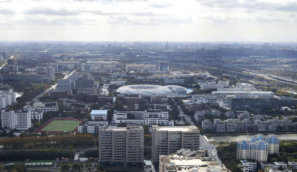 這是2023年11月25日在上海浦東新區(qū)張江科學(xué)城拍攝的形如鸚鵡螺的大科學(xué)裝置上海光源(中)(無人機照片)。新華社記者 方喆 攝