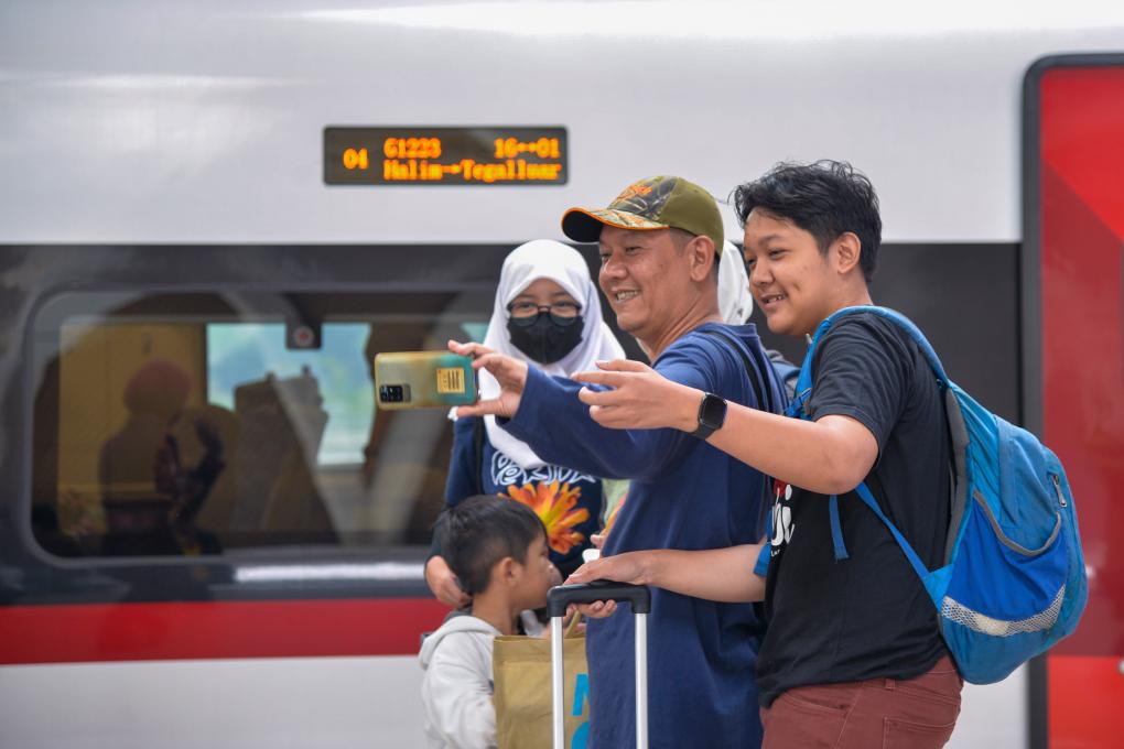 2023年12月25日,乘客在印度尼西亞雅加達(dá)的哈利姆車站站臺(tái)與雅萬高鐵高速動(dòng)車組合影。截至12月24日,作為中印尼共建“一帶一路”合作的“金字招牌”,雅萬高鐵累計(jì)發(fā)送旅客突破100萬人次。