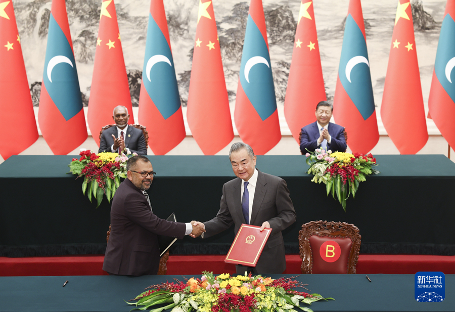 ??1月10日下午,國(guó)家主席習(xí)近平在北京人民大會(huì)堂同來(lái)華進(jìn)行國(guó)事訪問(wèn)的馬爾代夫總統(tǒng)穆伊茲舉行會(huì)談。這是會(huì)談后,兩國(guó)元首共同見(jiàn)證簽署雙邊合作文件。新華社記者 劉彬 攝