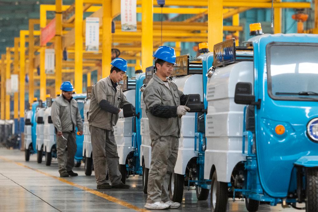 ?? 2月17日,在安徽省蕪湖市繁昌經(jīng)濟(jì)開發(fā)區(qū)愛瑞特新能源專用汽車生產(chǎn)車間里,工人組裝新能源電動清掃車。新華社發(fā)(肖本祥 攝)