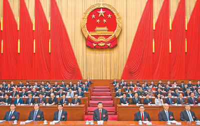 人民大會堂大禮堂氣氛隆重熱烈,主席臺帷幕正中的國徽在鮮艷的紅旗映襯下熠熠生輝。