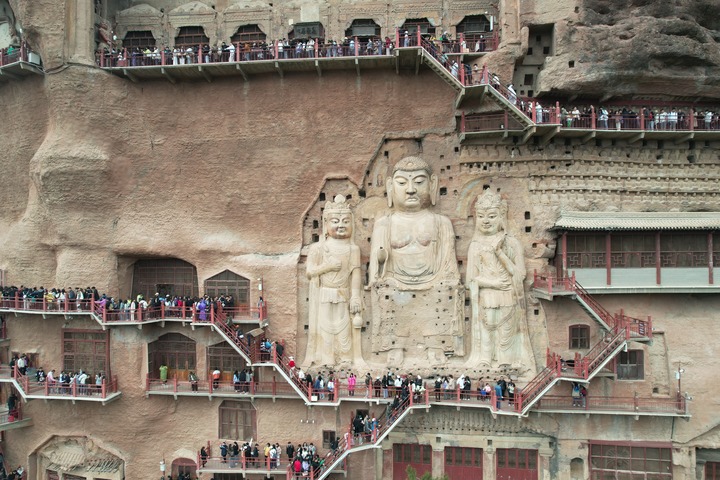 ??4月5日,游客在位于天水市麥積區(qū)的麥積山石窟游覽(無人機照片)。 新華社記者 張智敏 攝