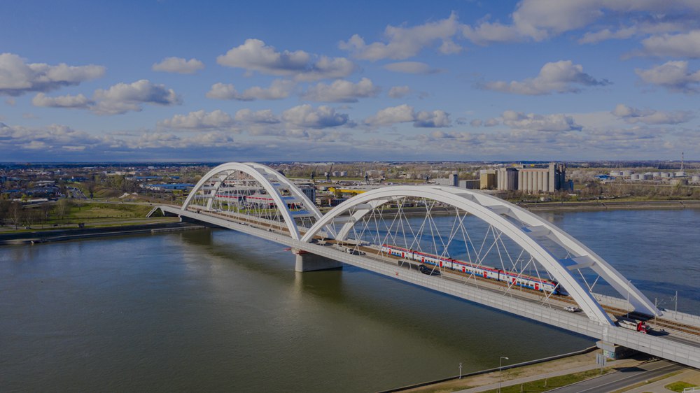 ??2024年3月12日,一列火車運行在匈塞鐵路塞爾維亞境內(nèi)貝諾段諾維薩德多瑙河大橋上(無人機照片)。新華社發(fā)(任衛(wèi)云攝)