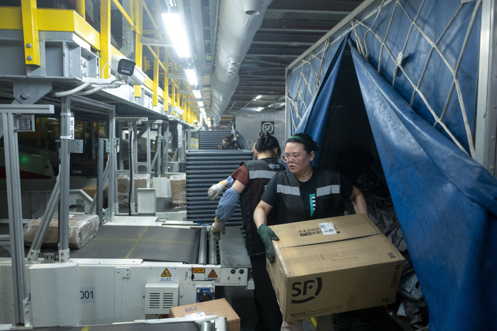 ??2024年5月25日凌晨,工人在湖北鄂州花湖國(guó)際機(jī)場(chǎng)轉(zhuǎn)運(yùn)中心進(jìn)行分揀作業(yè)。新華社記者 肖藝九 攝