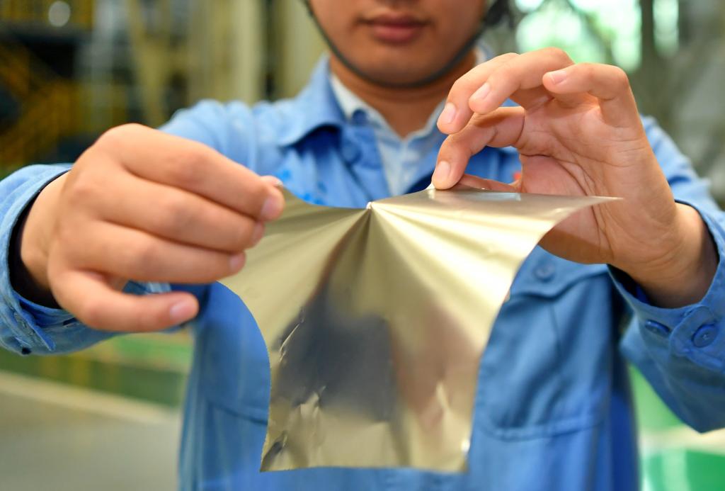 ??在位于山西的太鋼集團(tuán),員工展示用手撕開(kāi)0.02毫米厚的超薄帶狀不銹鋼(2019年5月24日攝)。新華社記者 曹陽(yáng) 攝