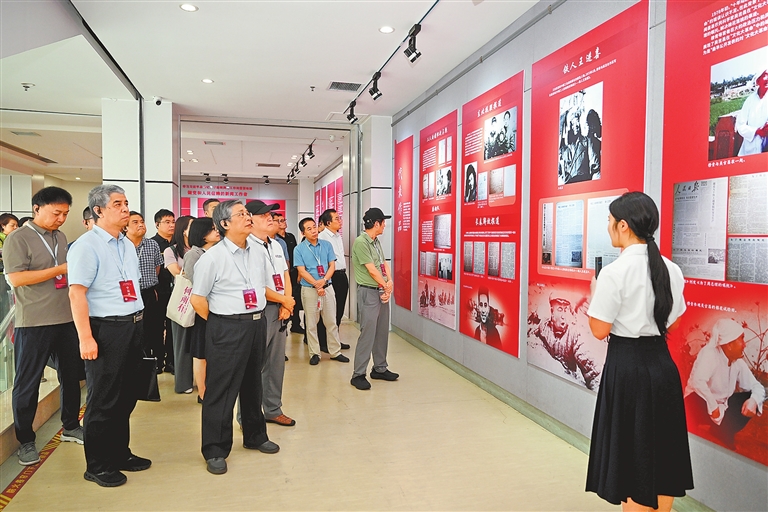 7月30日,全國(guó)多地的經(jīng)濟(jì)媒體負(fù)責(zé)人來到河南開封科技傳媒學(xué)院,參觀“勿忘人民——學(xué)習(xí)穆青、增強(qiáng)‘四力’”主題展。 河南日?qǐng)?bào)社全媒體記者 朱哲 攝