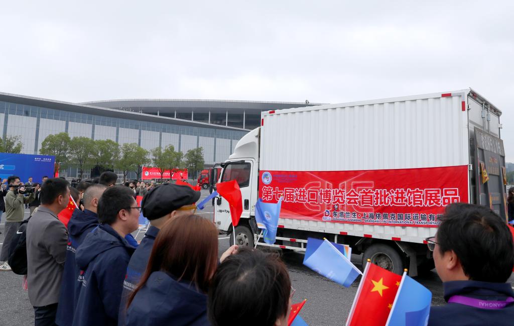??10月22日,裝載首批進(jìn)館展品的卡車駛?cè)雰x式現(xiàn)場(chǎng)。當(dāng)日,第七屆中國(guó)國(guó)際進(jìn)口博覽會(huì)首批展品進(jìn)館儀式在國(guó)家會(huì)展中心(上海)舉行。新華社記者方喆攝
