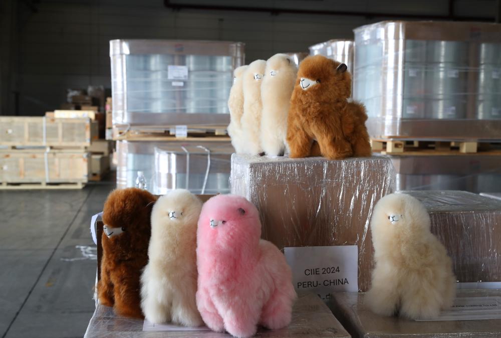 ??10月14日拍攝的運(yùn)抵中遠(yuǎn)海運(yùn)自有倉(cāng)庫(kù)的“溫暖駝”產(chǎn)品。當(dāng)日,中遠(yuǎn)海運(yùn)承運(yùn)的第七屆進(jìn)博會(huì)海運(yùn)首單展品秘魯“溫暖駝”系列產(chǎn)品由洋山港碼頭運(yùn)抵中遠(yuǎn)海運(yùn)自有倉(cāng)庫(kù),隨后改換短駁廂式車送往客戶公司。新華社記者方喆攝