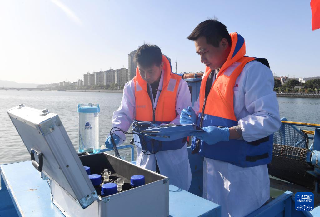 ??11月28日,在淅川縣鸛河流域城區(qū)段,南陽市生態(tài)環(huán)境局淅川分局工作人員記錄采樣水質(zhì)情況。